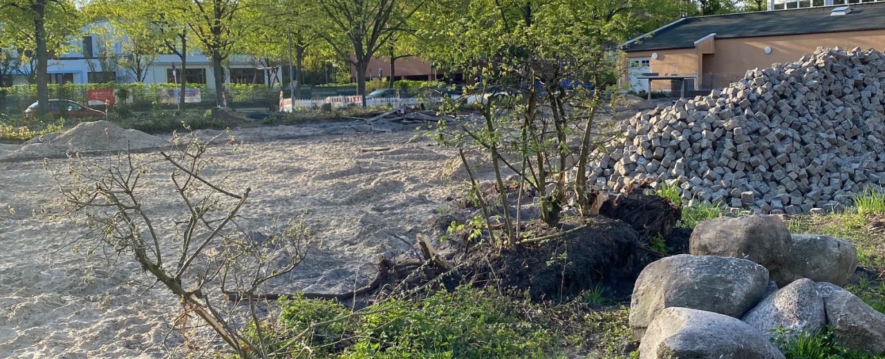 Heute beginnen die Abrissarbeiten der Tartanbahn und die Entsiegelung der Steinflächen. Die Spielgeräte, Tischtennisplatten und Bänke werden entfernt und für einen eventuellen Neueinsatz aufbewahrt.