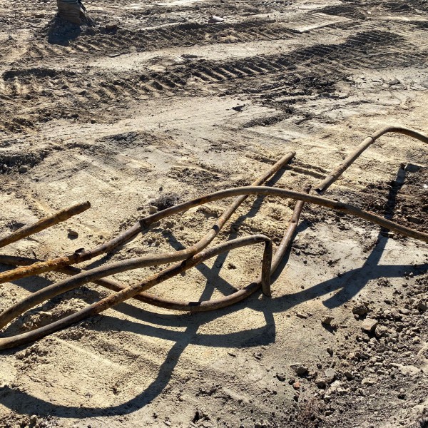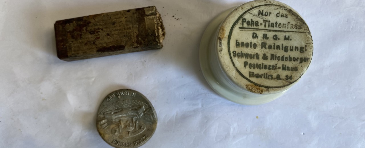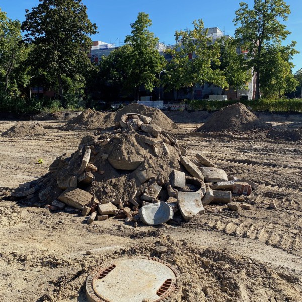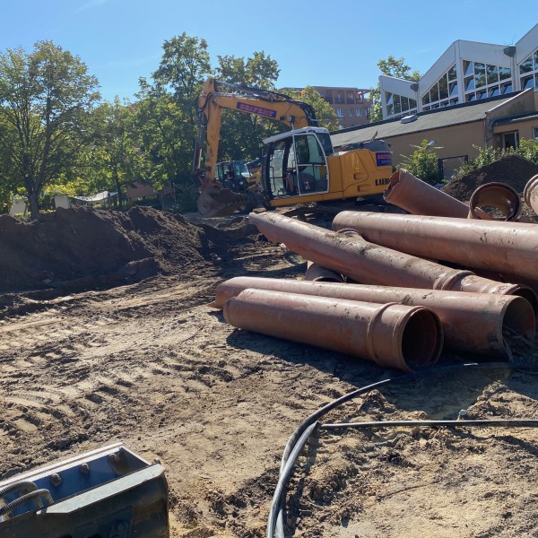 In diesen Tagen waren erneut Bagger auf unserem Hof aktiv, die den eigentlich bereits eingeebneten Bereich wieder umgruben. Dabei wurden noch einige Altlasten entfernt. Danach soll der Boden aber endgültig verdichtet werden und der Beton für die Bodenplatte kann kommen. Es sei denn der Kampfmittelräumdienst rückt erneut an, so wie das schon vor den Sommerferien der Fall war. In einem alten Schützengraben (unter dem ehemaligen Grünstreifen) wurden Handgranaten, Bajonette und eine Vielzahl weiterer alter Alltagsgegenständen gefunden.