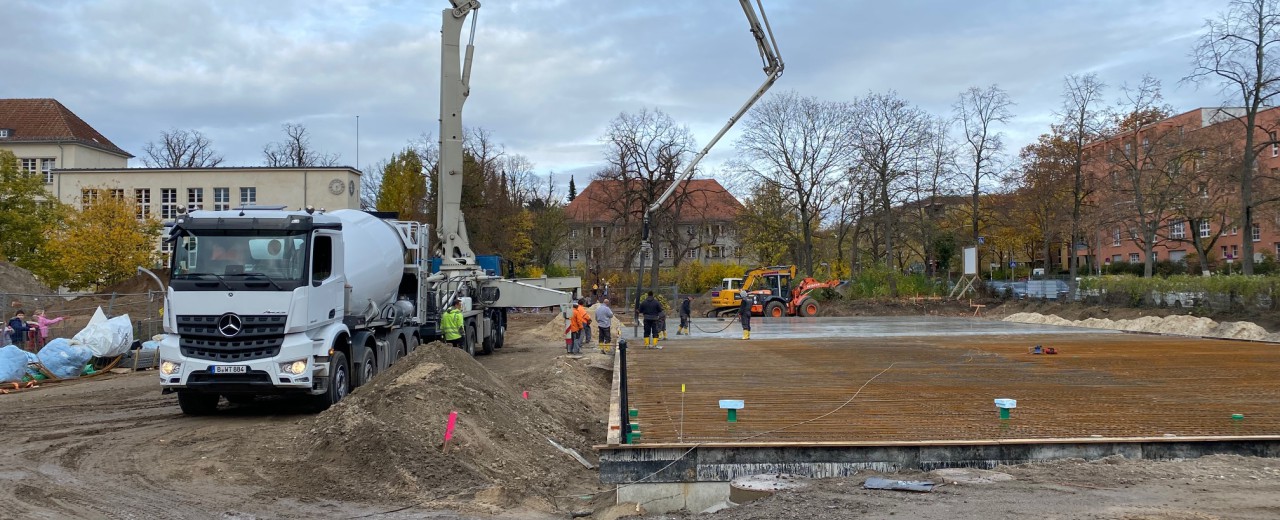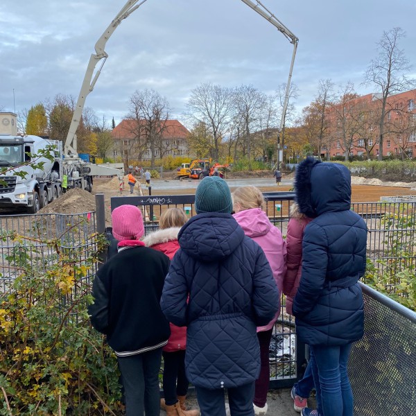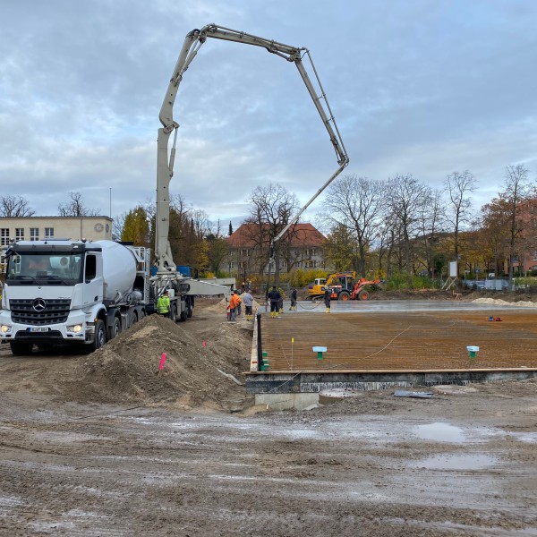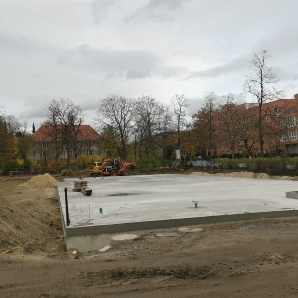 Tatsächlich war es am Donnerstag soweit und die Beton-Bodenplatte wurde gegossen. Das war natürlich für alle Kinder ein riesiges Spektakel, was es zu bestaunen galt. Der Beton ist zwar nach einigen Tagen hart, bis allerdings die gesamte Bodenplatte durchgehärtet ist, dauert es bis zu drei Wochen.