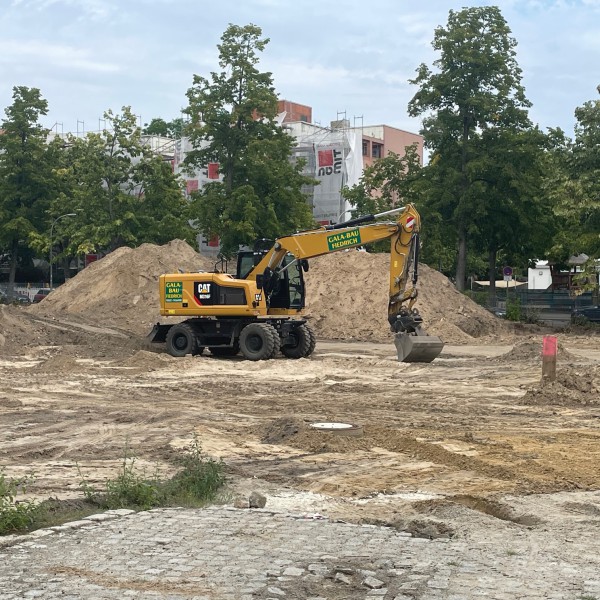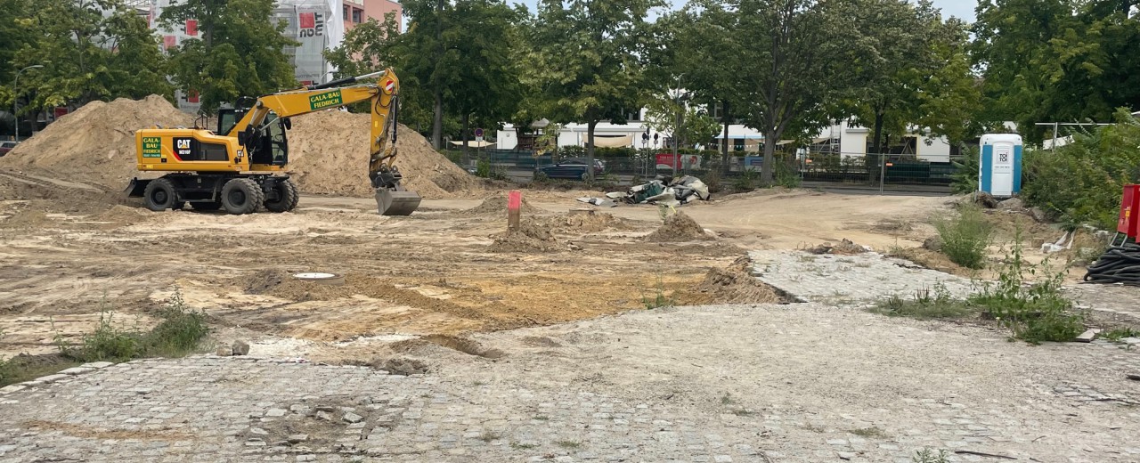 Die Bauarbeiten auf unserem Schulhof schritten auch während der Sommerferien voran. Inzwischen wurden die Leitungen für Wasser und Strom verlegt und die Vorbereitungen für das Gießen der Bodenplatte laufen an.