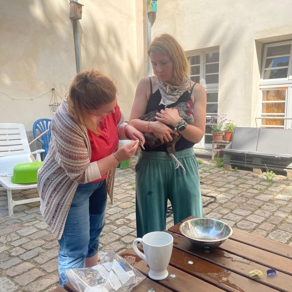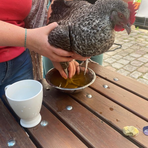 Unsere Henne Gloria hatte einen entzündeten Ballen. Sie muss sich im Garten etwas eingetreten haben. Denn der Ballen war geschwollen und sehr warm. Dank der liebevollen und fachmännischen Versorgung durch Frau Joppich, Frau Ullmann und Maxi mit Kamillenbad, Zugsalbe und einem Verband, war bereits nach 2 Tagen eine Besserung zu sehen.