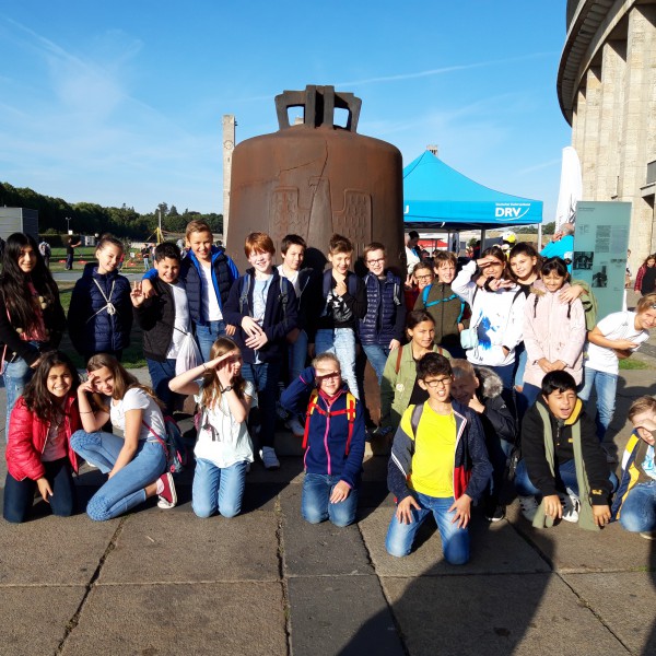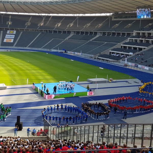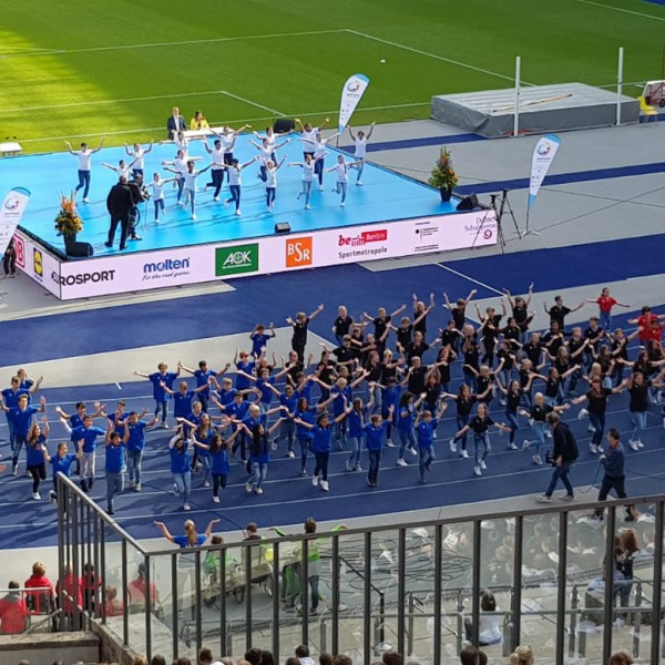 Nach dem Einmarsch der teilnehmenden Sportlerinnen und Sportler aller 16 Bundesländer, Ansprachen vom Bundespräsidenten und Berliner Bürgermeister, Interviews mit ehemaligen Sportgrößen und anderen Darbietungen führten etwa 250 Schülerinnen und Schüler, darunter die Klasse 5b unserer Schule, in der Westkurve des Stadions auf der blauen Laufbahn eine dreiteilige Tanzchoreographie vor, die von einem Choreographen-Team des BTFB (Berliner Turn- und Freizeitsport-Bund e. V.) entwickelt worden war. Als eindrucksvolles Schlussbild stellten alle Tänzerinnen und Tänzer mit ihren jeweiligen farblichen T-Shirts die fünf Olympischen Ringe dar.