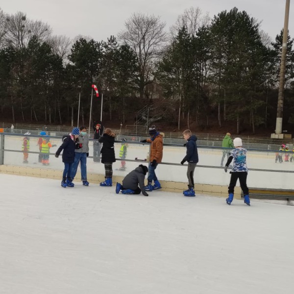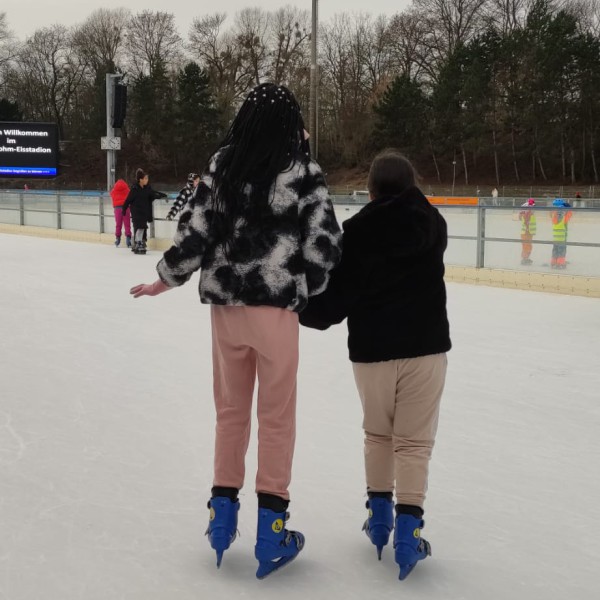 Während die Skifahrerinnen und Skifahrer in Niederau/Österreich die Schneepisten eroberten, hieß unsere Mission Eis und zwar eiskalt. Die in Berlin verbliebene Schülergruppe machte sich auf zum nahegelegenen Eisstadion, um sich teilweise das erste Mal auf dem Eis auszuprobieren. Schnell waren die Schlittschuhe angezogen, dann ging es teils mutig, teils zurückhaltend auf die Eisbahn. Die erfahrenen Eisläufer*innen zogen Runde um Runde auf der großen Eisbahn, schnell wurde es warm und die Jacken abgelegt. Doch auch die Neulinge ließen sich nach anfänglichen Stürzen sprichwörtlich nicht aus der Bahn werfen und (unter)stützten sich. So wurden sie mit jedem Schritt sicherer auf dem Eis und hatten vor allem zusammen großen Spaß. Die zwei Stunden beim Schlittschuhlaufen vergingen schnell und gut gelaunt nahmen sich die Kinder vor, schon bald wieder zum Eisstadion zurückzukommen.