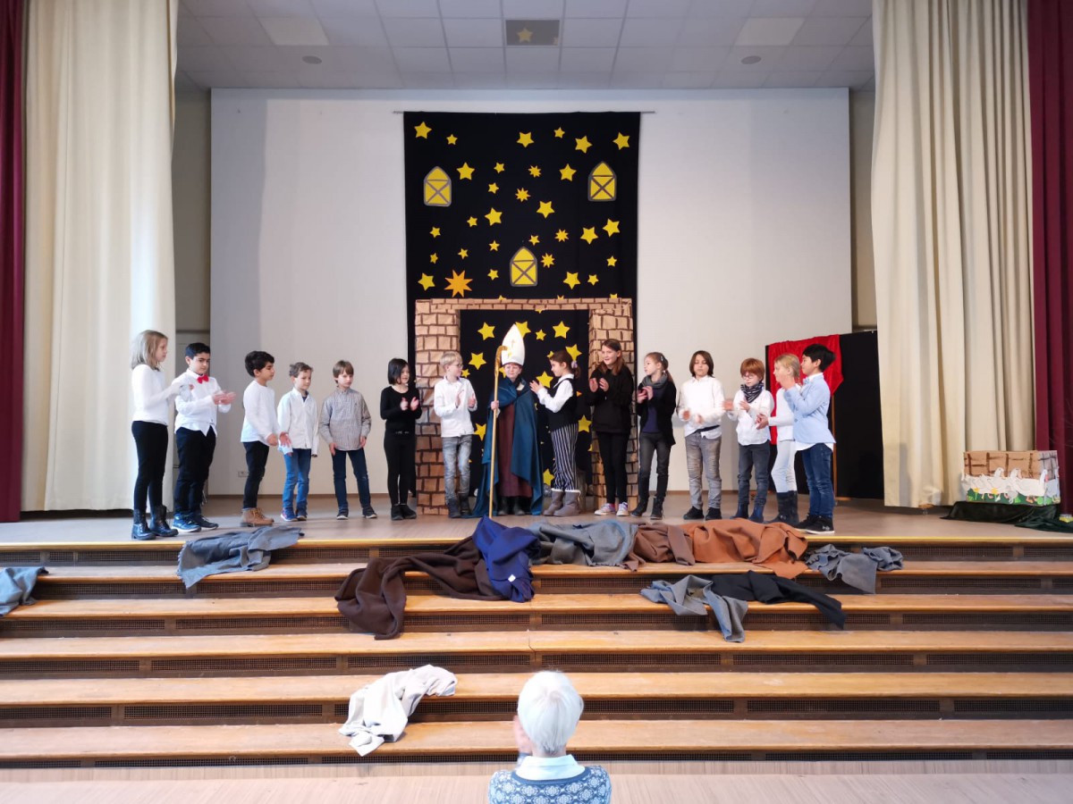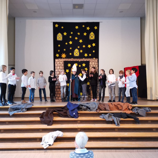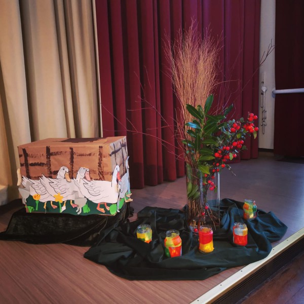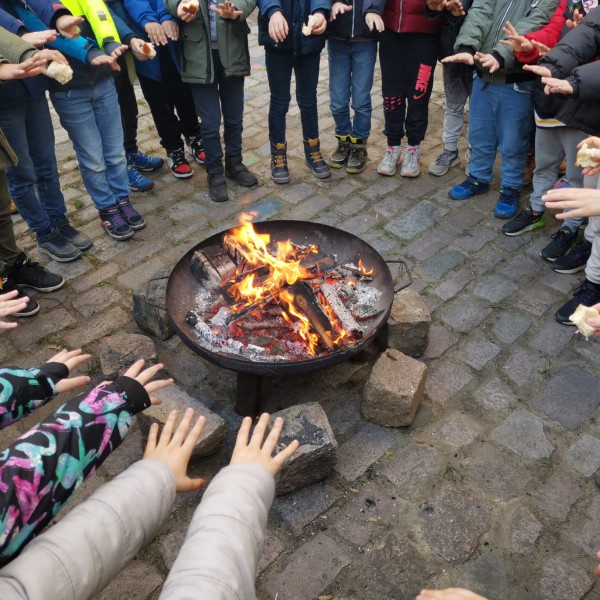 Martinsfest ohne Laternenumzug im Dunkeln, ohne Posaunenklänge, ohne Elterngespräche am Feuer, ohne Punsch und Brezeln, stattdessen: Ein inniges, kleines Fest: Schüler*innen der Klassen 4a/b führten bei weit geöffneten Fenstern in der Aula das Martinsspiel auf, begleitet vom „ Mann“ am Klavier, einem Schüler aus der Klasse 4a, wenn schon nicht selbst singen, dann wenigstens hören – insgesamt achtmal!!! wurde das Spiel gezeigt, so konnten die Zuschauergruppen klein gehalten werden. Am Ausgang eine kleine Martinsgans, die den Weg zum Martinsfeuer im Schulgarten versüßen sollte. Eine kleine Weile ins Feuer schauen, sich wärmen lassen und Martinsbrötchen genießen, ein Moment gemeinsamer Freude, geteilt von Kindern, Lehrer*innen und Erzieher*innen und unserem Hausmeister, dem Hüter des Feuers – und von Zeit zu Zeit drangen Klänge aus dem Musikraum herüber: „ Freude schöner Götterfunken“ – auch schön!
