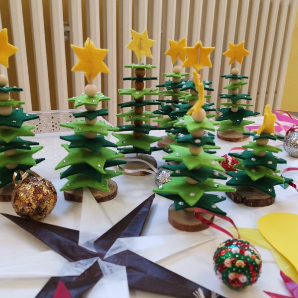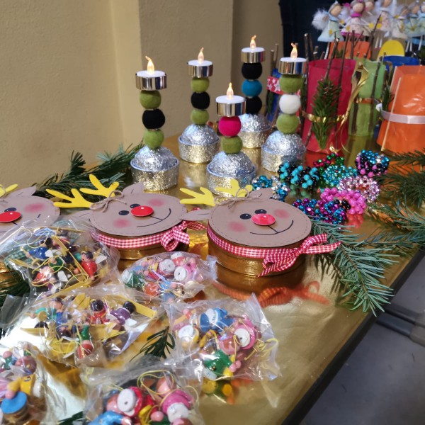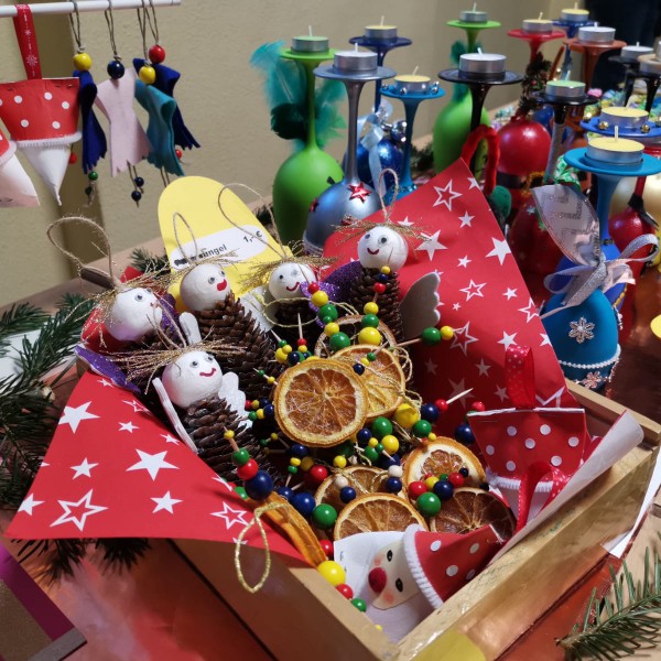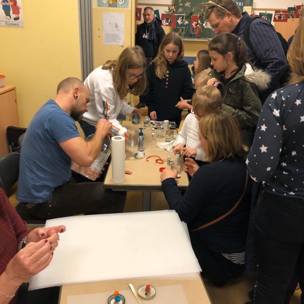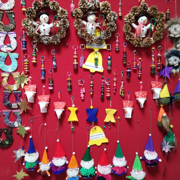 So beschränkten sich die Feierlichkeiten dieses Jahr nicht nur auf die Aula der ASG, in der wie gewohnt einzelne Klassen Lieder, Gedichte und kurze Theaterstücke präsentierten, sondern auch in anderen Teilen des Schulgebäudes war der Andrang von Schüler*innen, Eltern und Verwandten groß. In den Gängen im Erdgeschoss der Schule und der eFöB gab es seit langer Zeit wieder einmal einen Weihnachtsbasar, auf dem verschiedenste, von den Schüler*innen selbst hergestellte Weihnachtsdekoration verkauft und natürlich auch in großen Mengen gekauft wurde. Darüber hinaus gab es, über die ganze Schule verteilt, eine ganze Reihe von Mitmachaktionen, bei denen vor Ort Weihnachtskerzen, Windlichter, Schneekugeln und vieles mehr hergestellt werden konnten. Zum kurzen Verschnaufen und aber auch zum Verweilen lud die Mensa ein, in der der Förderverein der ASG ein Café eingerichtet hatte, in dem Kuchen aller Art und die entsprechenden Getränke angeboten wurden.