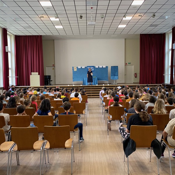 Am vergangenen Dienstag war es endlich wieder so weit: Tina Kemnitz war erneut zu Besuch in unserer Aula und hat uns viele tolle Bücher vorgestellt! Es wurde gerätselt, gedichtet und vor allem viel gelacht. Passend für die Jahrgänge 1 und 2 sowie für die Großen in den Klassen 3 & 4 und 5 & 6 wurden jeweils sechs verschiedene Bücher vorgestellt. Neben Comics und Erzählungen wurden auch lustige Gedichte präsentiert, sodass sicherlich für jeden Geschmack ein passendes Buch dabei war. Wir hoffen, die Geschenkewünsche wurden so „charmant“ übermittelt, wie von Frau Kemnitz vorgeschlagen!