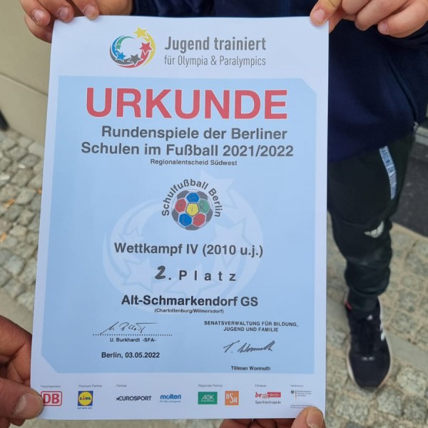 13.5.2022 Regionalentscheid: Nachdem man im Jahr 2019 noch knapp im Regionalentscheid ausgeschieden war (obwohl man den damaligen amtierenden Berliner Meister „Schele Schule“ zuvor noch im Bezirksentscheid geschlagen hatte), wollte unsere Schulmannschaft diesmal als frischer Vizemeister des Bezirks Charlottenburg-Wilmersdorf unbedingt eine Runde weiter kommen. Diesmal gelang uns das auch. Nach einem hart umkämpften Turnier standen wir am Ende des Tages auf einem hochverdienten 2. Platz im Regionalentscheid und qualifizierten uns somit als eine von 8 verbleibenden Grundschulen für das Viertelfinale (Landesentscheid).