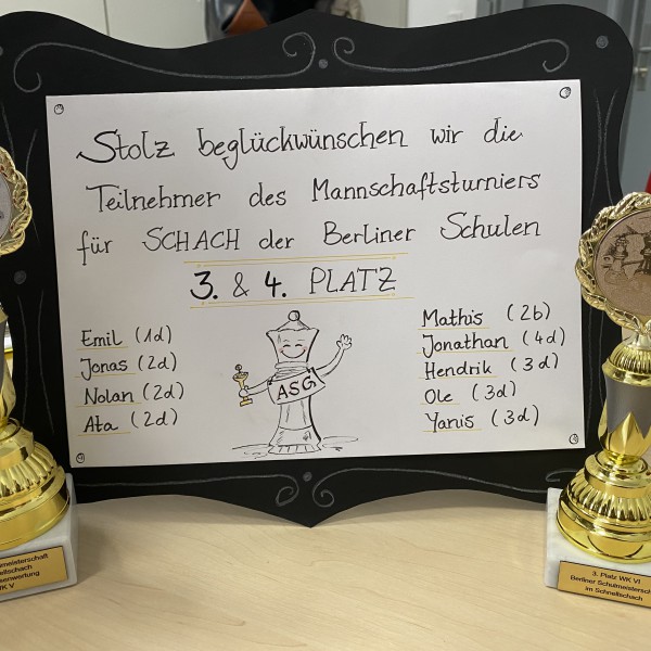 Wer derzeit bei uns in die Schule kommt, wird wahrscheinlich ziemlich geblendet. Geblendet von den beiden Pokalen unserer Schul-Schachmannschaft in den Vitrinen im Foyer. Denn die Kinder aus den 1. bis 4. Klassen der ASG haben in der Mannschaftswertung der Berliner Schulmeisterschaft den 3. und 4. Platz belegt. Schon seit Jahren sind die Teilnehmer der Schach-AG unter der Leitung von Herrn Florent Mayer ein Garant für tolle Erfolge an der ASG. Der gesamten Mannschaft und ihrem Trainer Herzlichen Glückwunsch zu diesem tollen Mannschaftserfolg im Januar 2023.
