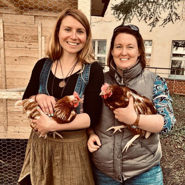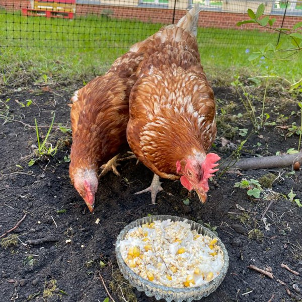Unsere Hühner sind da! An einem sonnigen Samstag in den Osterferien haben Frau Ulmann und Frau Joppich 4 Hühner in den selbst gebauten Stall in der grünen Oase einziehen lassen. In einer durch den Verein „Stark für Tiere e.V.“ organisierten Rettungsaktion konnten die vier Hühner aus einem Betrieb geholt werden, in dem sie in den nächsten Tagen nach einem einjährigem Eier-Lege-Dasein nur der Tod erwartet hätte. Noch etwas aufgeregt, aber mutig und neugierig erkunden die vier Hennen seitdem ihr neues Zuhause. Auch die zahlreichen Schulklassen, die schon fleißig die zum Teil noch namenlosen Tiere bestaunen, schrecken diese nicht. Fleißig scharren sie nach Würmern, picken das Gras im Akkord und legen sogar noch das ein oder andere Ei. Nur das abendliche Einziehen in den fuchssicheren Stall möchte noch nicht so klappen und daher fahren Frau Ullmann und Frau Joppich im Wechsel in den Abendstunden noch einmal in die Schule, um den vier Hühner eine persönliche Einladung zu überreichen und einen kleinen Stups in die richtige Richtung zu verpassen. Aber das wird schon werden, denn ein paar gekochte Kartoffeln wirken zumindest bei diesen Hennen schon Wunder.
