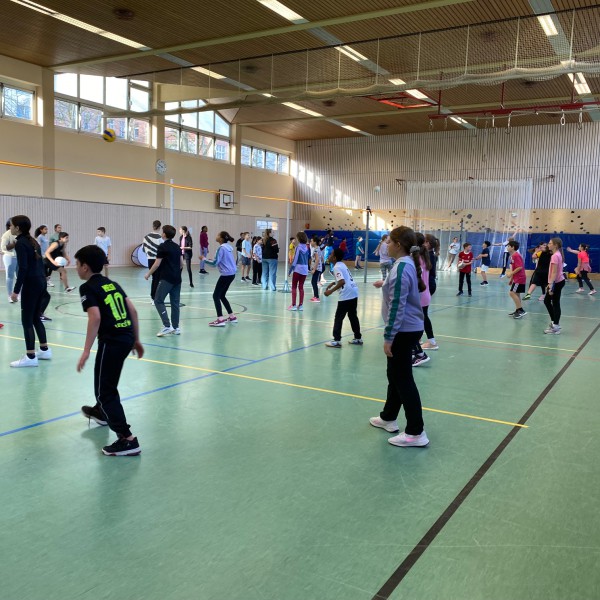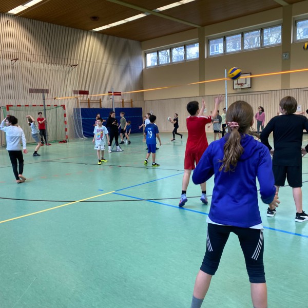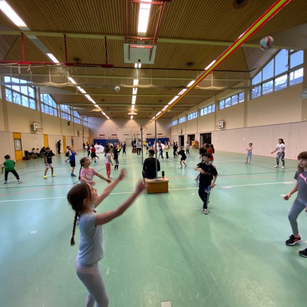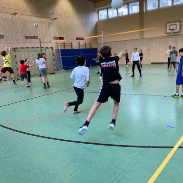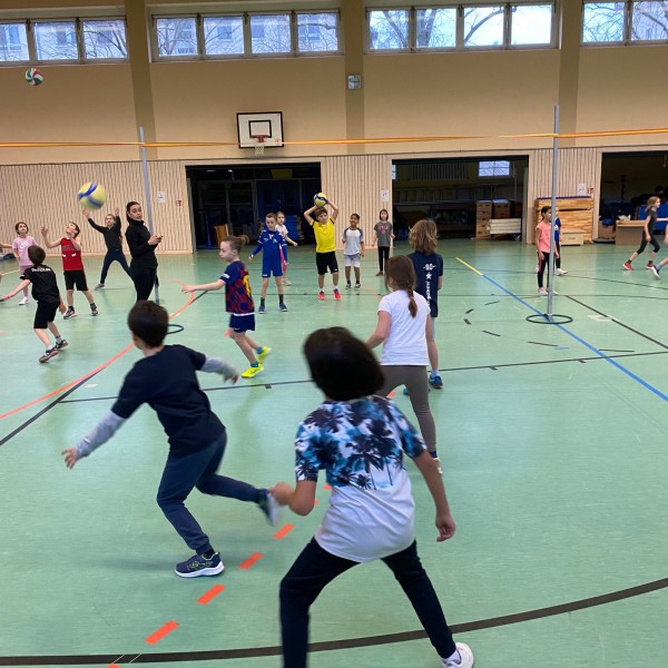 Zum Glück hatten die 3.-6.-Klässler*innen gerade eine Woche Winterferien. So konnten sie sich von den aufregenden und teilweise anstrengenden sportlichen Stunden in der großen Sporthalle erholen. Wie schon in den letzten Jahren veranstalteten hier die RB Volleys und der Fachbereich Sport an zwei Tagen ein Ball-über-die-Schnur-Turnier. Dabei mussten Kleingruppen von 5-6 Spieler*innen gegeneinander antreten und versuchen den Ball über eine Schnur im gegnerischen Feld zu platzieren. Um es noch etwas spannender zu machen, wurde immer mit 2 Bällen gespielt. Alle Kinder waren Feuer und Flamme und legten sich richtig ins Zeug. Am Ende wurden die jeweils besten Kleingruppen und die beste Klasse eines Jahrganges geehrt. Es gab Trinkflaschen und Urkunden, viel Jubelgeschrei und auch einige Tränchen. Spaß hatten aber alle und so freuen wir uns schon aufs nächste Jahr, wenn die RB Volleys rund um Ahmed, der durch das Programm „Sport macht Schule“ an unserer Schule eingesetzt ist, wieder in unsere Halle einziehen.