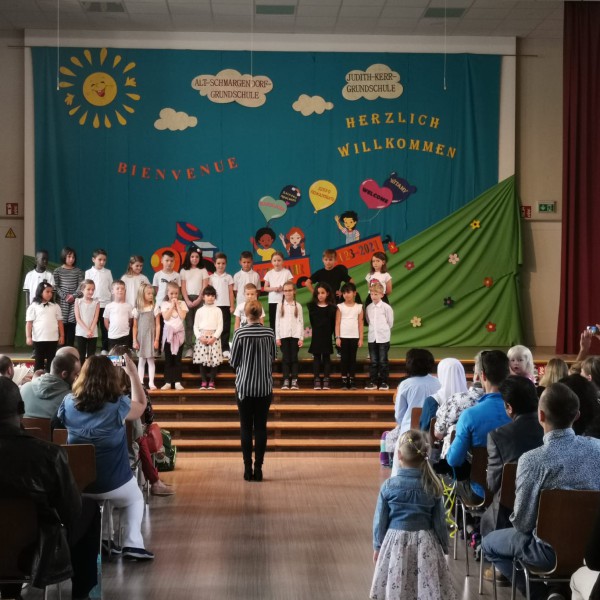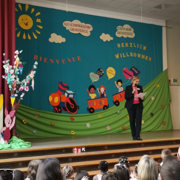 Schon seit einer Woche herrschte im Schulgebäude der ASG eine angenehme Vorfreude, da lag eine gewisse Spannung in der Luft. Erzieher*innen und Lehrer*innen huschten durch die Flure, Schultüten wurden von rechts nach links getragen, der Hausmeister schwang den Besen und Klassenzimmer wurden auf Hochglanz poliert. Denn heute stand die Einschulung unserer neuen Erstklässler*innen auf dem Programm. Dazu strömten zahlreiche Eltern mit aufgeregten und festlich gekleideten Kindern mit riesigen und bunten Schultüten in das festlich geschmückte Schulhaus in Richtung Aula. Als jede*r erst einmal den richtigen Platz gefunden hatte, führten Jamal, Leonie und Frau Ullmann als Blumenfee durch das bunte Bühnenprogramm: da wurde Geige gespielt, geturnt, getanzt und musiziert, Frau Sülflow hieß alle herzlich Willkommen und schließlich fanden sich die neuen Erstklässler*innen bei ihren Lehrerinnen und Erzieherinnen auf der Bühne ein. Während die Kinder dann hinter den Türen ihrer neuen Klassenzimmer verschwanden, warteten die Eltern und Verwandten gespannt bei Kaffee und Kuchen auf den Nachwuchs. An dieser Stelle ein großes Dankeschön an den Förderverein für die Verköstigung der Familien und an das gesamte Einschulungs-Team für diesen unvergesslichen Tag für die neusten Mitglieder der ASG.