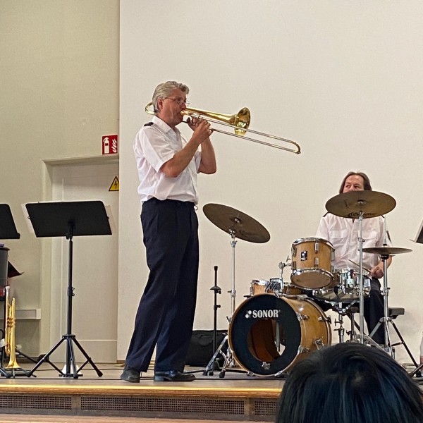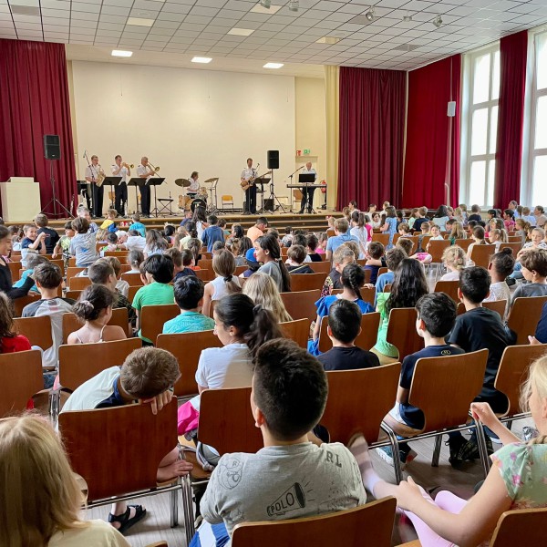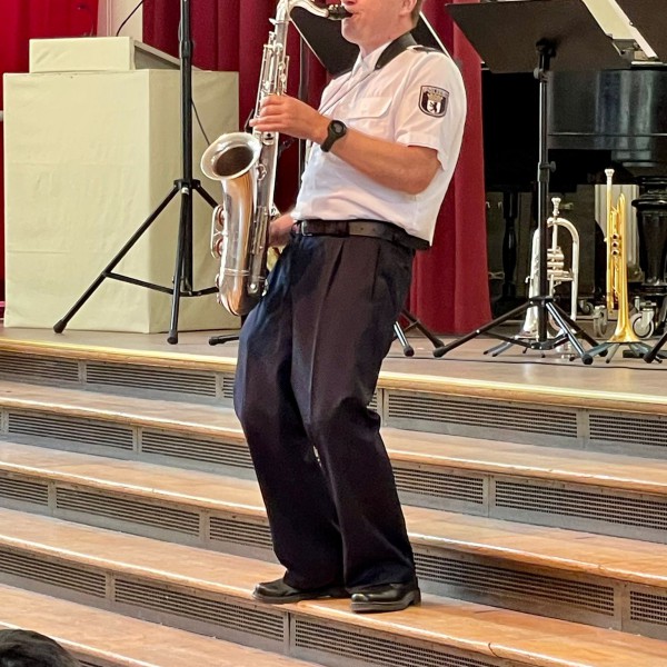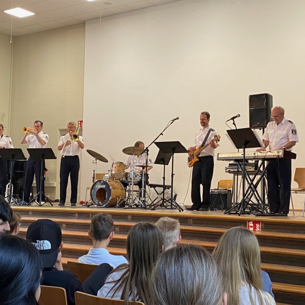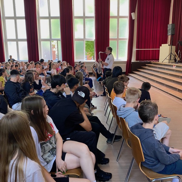 …oder auch in der Aula der ASG, als wir eine musikalische Darbietung der ganz besonderen Art erhielten. Am heutigen Donnerstag waren sechs Polizisten des Landespolizeiorchesters Berlin/Brandenburg zu Gast an unserer Schule und haben den Schüler*innen und Pädagog*innen ihre Instrumente vorgestellt. Dabei spielten sie mit Querflöte, Schlagzeug, Flügelhorn, Trompete, E-Bass, Altsaxophon, Tenorsaxophon, E-Piano, Klarinette und Posaune vor allem bei den Kindern bekannte Songs wie die Titelmusik der Simpson, Fluch der Karibik, Super Mario oder eben auch Star Wars. Jeder Musiker erklärte zwischendurch den Aufbau und die Herkunft seiner eigenen Instrumente und das begeisterte Publikum wurde durch Fragen und Mitklatschen miteinbezogen. Wir danken vor allem Frau Götz, die diese tolle Combo zu uns an die Schule geholt hat und können nur mit den Worten abschließen: Möge die Musik mit euch sein!