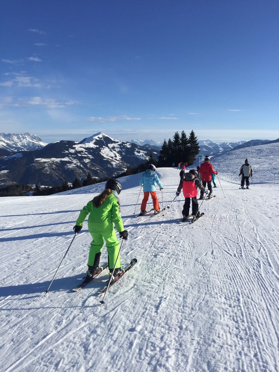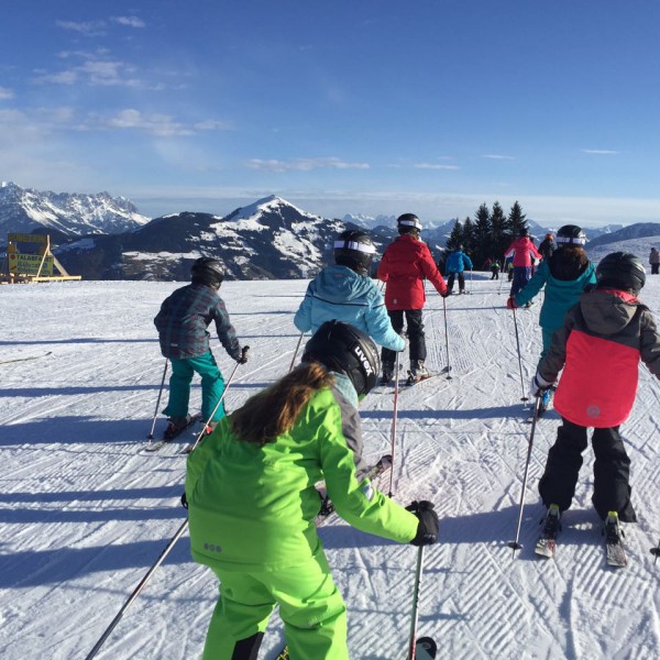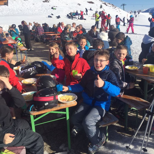 Heute sind alle Kinder mit der Gondel nach oben gefahren. Nachdem alle das Liften mit dem Schlepplift ohne Probleme gemeistert hatten, sind wir einige Abfahrten auf der roten Piste gefahren. Anschließend gab es auf der Hütte bei strahlendem Sonnenschein Pommes, Würstchen und etwas zu trinken.
