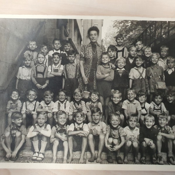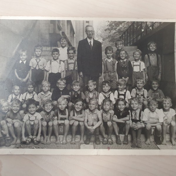 Erklärung zu den Fotos: Auf dem Bild mit Herrn Rusche sitze ich in der zweiten Reihe von unten, ich bin der vierte von rechts , mit Matrosenbluse. Herr Hohnstetter steht auf dem anderen Bild mit Frau Ruprecht in der dritten Reihe von unten, der zweite von rechts mit Stullentasche.