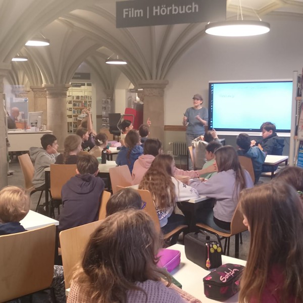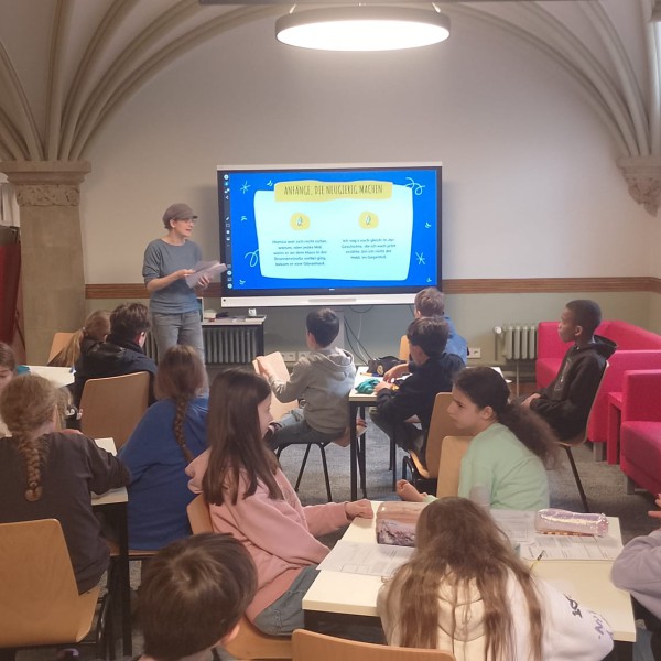 Gemeinsam mit der Autorin Kathrin Tordasi haben die Schülerinnen und Schüler der 5. Klassen in einer interessanten Schreibwerkstatt ihre eigenen Abenteuergeschichten entwickelt. So entstanden in den Räumen der Adolf-Reichwein-Bibliothek aus ungewöhnlichen Wörtern wie Playbutton, Papierschleife, Tisch, schreien, kämpfen und wegrennen fantasievolle Ideen, Figuren und ganze Welten.
