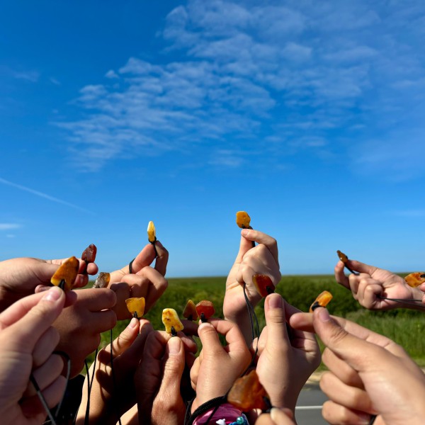 Am Donnerstag, dem 03.07.2025 haben wir Bernsteine geschliffen. Wir wurden in zwei Gruppen eingeteilt. In jeder Gruppe waren neun Kinder. Die eine hat Bernsteine geschliffen, die andere hat Briefe nach Hause geschrieben. Es gab viele verschiedene Bernsteine, jeder konnte sich einen aussuchen. Alle sahen anders aus. Fr. Ullmann hat uns erklärt, woran man einen Bernstein erkennt: Bernstein geht im Gegensatz zu normalen Steinen nicht im Salzwasser unter, sondern schwimmt an der Oberfläche. Nach einer Weile wurde gewechselt. Es hat großen Spaß gemacht. Am Ende hatte jeder eine schöne Bernsteinkette.
