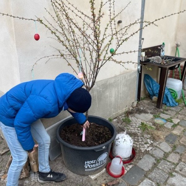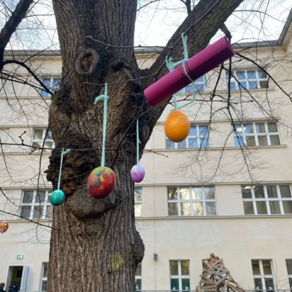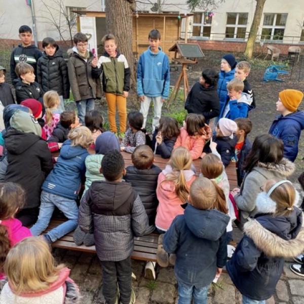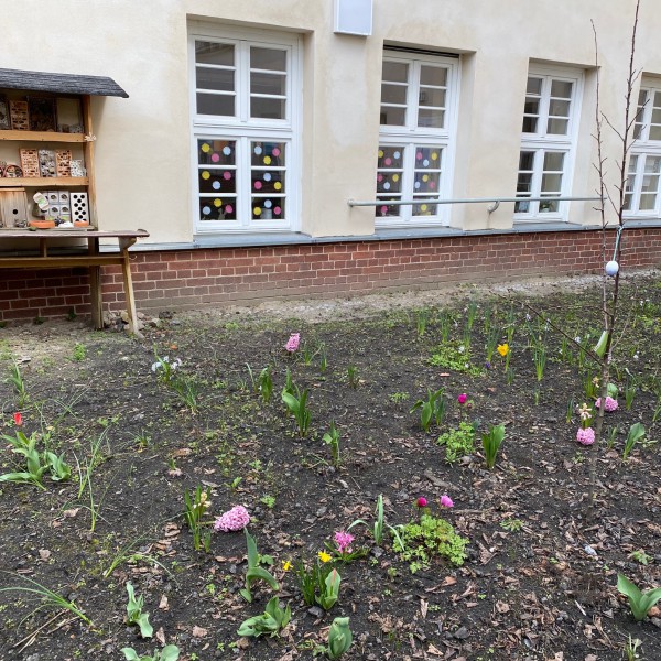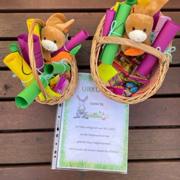 Oder wie am heutigen Tag die Osterrätsel. In der frühlingshaften Grünen Oase wurde heute fleißig gesucht und gerätselt. Neben den blühenden Narzissen, Hyazinthen und Tulpen, vielen Meisen, die ihre Nistplätze aufsuchten und gurrenden Hühnern, konnte man fleißige Fünftklässler in der Oase herumschleichen sehen. Sie versteckten kleine Osterrätsel für die Kinder der ersten Klassen. Wurden alle Osterrätsel gefunden, begann das wilde Rätseln rund um verliebte Zahlen, das Buchstabieren von Osterwörtern und Sachfragen zu Hase und Huhn. Als endlich alle Rätsel gelöst waren, musste nur noch das Lösungswort gepuzzelt werden und die Klassen bekamen eine Urkunde und ein Osterkörbchen überreicht. Ein großer Dank geht an die Kinder der Klasse 5a, die die Ostersuche allein vorbereitet und durchgeführt und einen Teil ihres Geldes vom Kuchenverkauf für die Osterkörbchen verwendet haben. Wie gut, dass wir einen so schönen Schulgarten haben, an dem das Suchen gleich doppelt so viel Spaß macht!