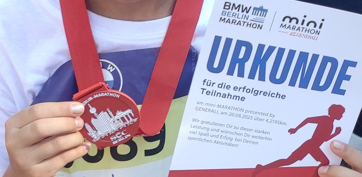 Beim Mini-Marathon liefen 30 Kinder exakt 4,2195 Kilometer vom Potsdamer Platz bis zum Zieleinlauf auf der Straße des 17. Juni. Bei sommerlichen 25 Grad strahlten die Sonne und die sichtlich stolzen Läuferinnen und Läufer um die Wette, als sie ihre Medaillen und Urkunden für diesen tollen sportlichen Einsatz erhielten.