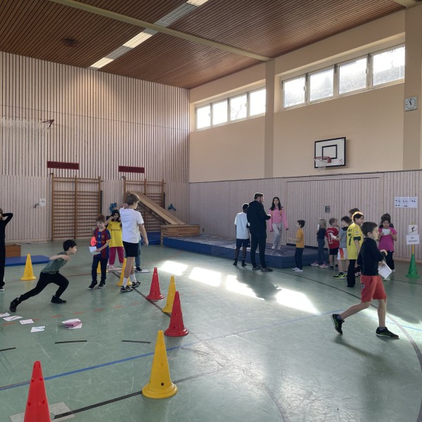 Beim Skispringen gab es eine Bank, einen Kasten und eine Landmatte, man ist mit einem Teppich runtergerutscht und auf einem Kasten gelandet und dann ist man gesprungen. Man hatte drei Versuche und hat die beste Zahl auf einen Zettel eingetragen. In der kleinen Halle gab es einen Quiz zu den weltweiten Olympischen Spielen und es ein Wettrennen mit verschiedenen Übungen, z. B. Werfen. (Frieda, Amalia)