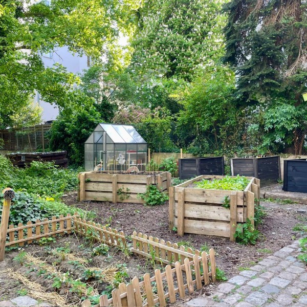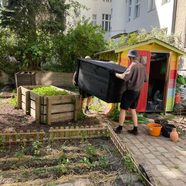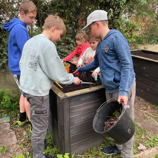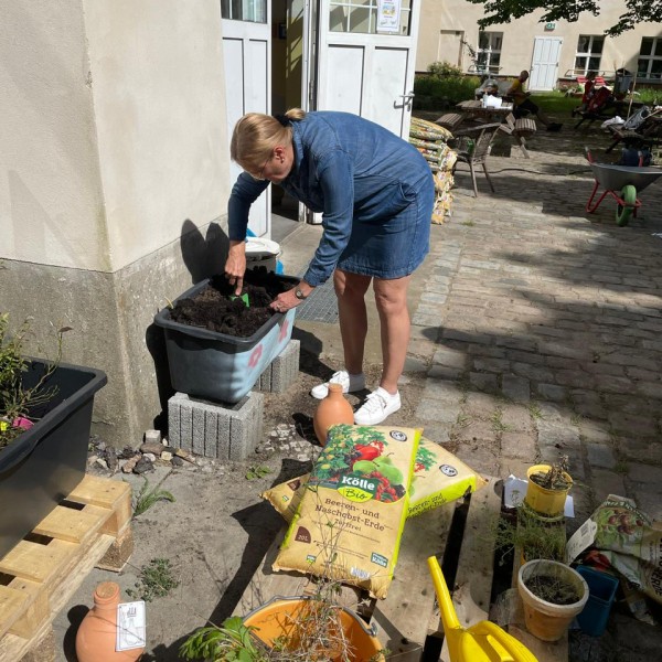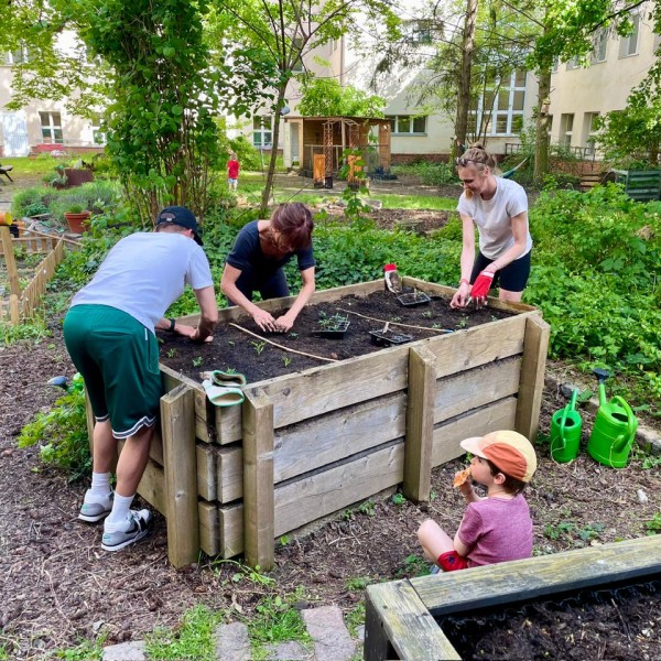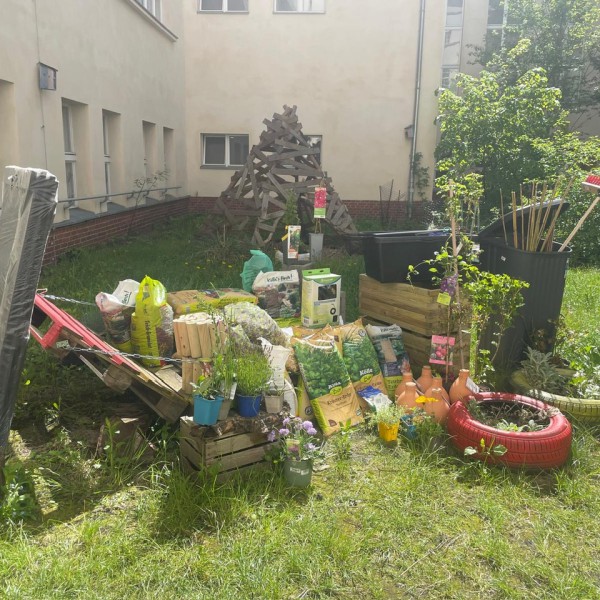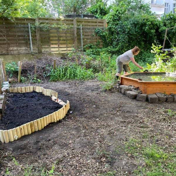 Der große Einkauf im Bau- und Pflanzencenter musste natürlich auch „verbaut“ werden und so fanden sich Anfang Mai viele Helfer*innen zusammen, die die Regentonne anschlossen, Beete aufbauten, Beete anlegten und pflegten, den Teich begrünten und Pflanzen aus dem Gewächshaus in die Beete pflanzten. Nun haben wir in unserer Grünen Oase eine Naschecke mit Obststräuchern, in deren Töpfe zusätzlich Ollas gepflanzt wurden, um die Pflanzen an heißen Tagen mit ausreichend Wasser zu versorgen.