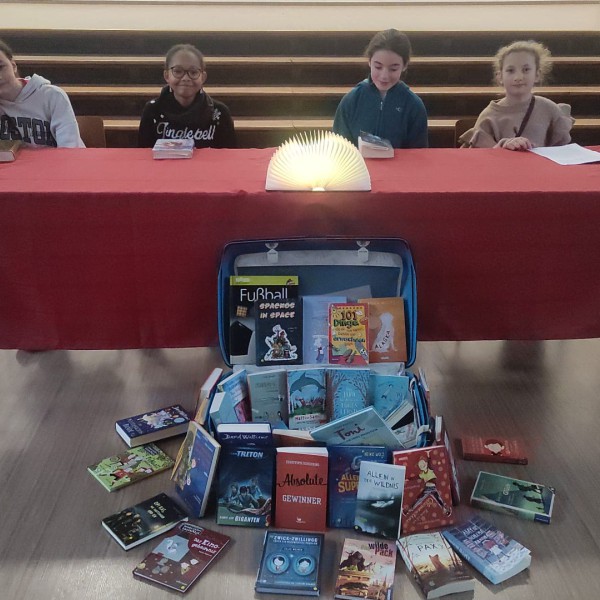 In der vergangenen Woche war in der Aula alles für das Vorlesen hergerichtet. Die sechsten Klassen fochten hier am Donnerstag ihren Vorlesewettbewerb aus. Jeweils eine Schülerin der Klassen 6a – 6d, die ihren klasseninternen Vorlese-Wettkampf gewonnen hatte, durfte zunächst aus einem Wunschtext und dann aus einem Fremdtext vorlesen. Die sachkundige Jury, bestehend aus Frau Sülflow, Frau Rühl, Frau Branscheid, Katharina und Vincent bewertete in den drei Minuten des Vorlesens sowohl die Lesetechnik, als auch die Interpretation und die Textstellenauswahl (beim eigenen Text). Nach dem Vorlesen zog sich die Jury zur Beratung zurück, während die anwesenden Zuhörer-Klassen ihre Vorleserinnen ausgiebig feierten. Am Ende war es ein sehr knapper, aber verdienter Sieg für Leonie aus der Klasse 6a. Sie konnte sich gegen Victoria (6d), Linai (6c) und Mia (6b) durchsetzen. Ihr Sieg wurde stimmungsvoll von Leseprofi Katharina verkündet und mit einem Buchgutschein aus der Buchhandlung Schmargendorf belohnt. Alle vier Teilnehmerinnen gewannen jede einzelne die Herzen der Zuhörer*innen und wir sind stolz auf Leonie, die unsere Schule beim Bezirksentscheid vertreten wird.
