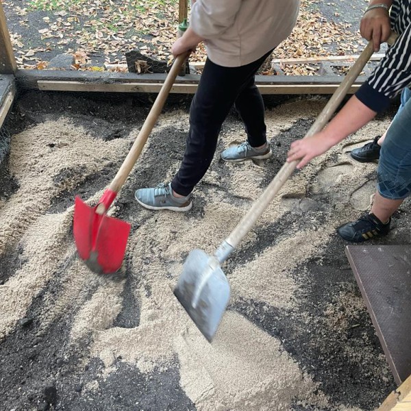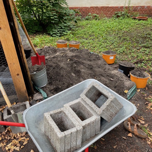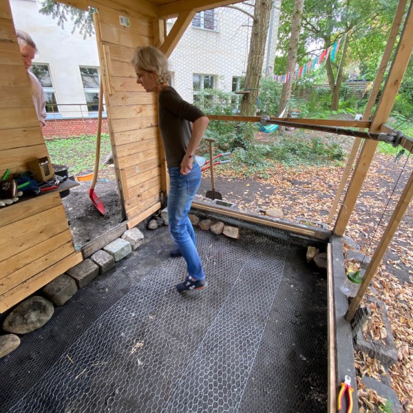 Eigentlich war es schon vor den Sommerferien klar, aber dennoch hat es bis zum Schuljahresbeginn gedauert, ehe wir vier neue, diesmal junge Hühner in unserer Oase einziehen ließen. Hierfür musste nämlich zunächst einmal der Stall nachgerüstet werden. An einem Sonntag trafen sich daher einige Kolleginnen in der Oase und schaufelten, was das Zeug hielt. Als der Sand erst einmal draußen war, wurde der Boden des Außenstalls fachmännisch mit Draht ausgelegt, festgeschraubt und mit Pflanzsteinen beschwert. Danach wurde der Sand wieder hineingeschaufelt und auch an anderen Stellen wurde nachgebessert. Und am 29. August war es dann soweit und vier Hühner vom Geflügelhof Saballus zogen bei uns ein. Dieses Mal haben wir uns bewusst für vier unterschiedliche Rassen und damit Farben entschieden, damit alle ASGler*innen unsere Hühner auch auseinanderhalten können. Ein erstes, kleines Ei durften wir auch schon bewundern. Herzlich Willkommen also an Tamara (Bovan schwarz), Gloria (Sperber), Bruni (Araucaner) und Hildegard (Leghorn weiß).