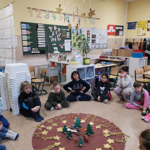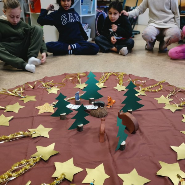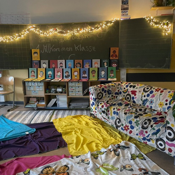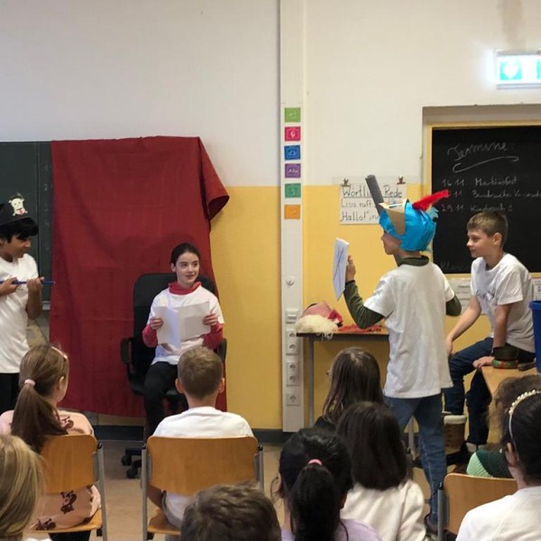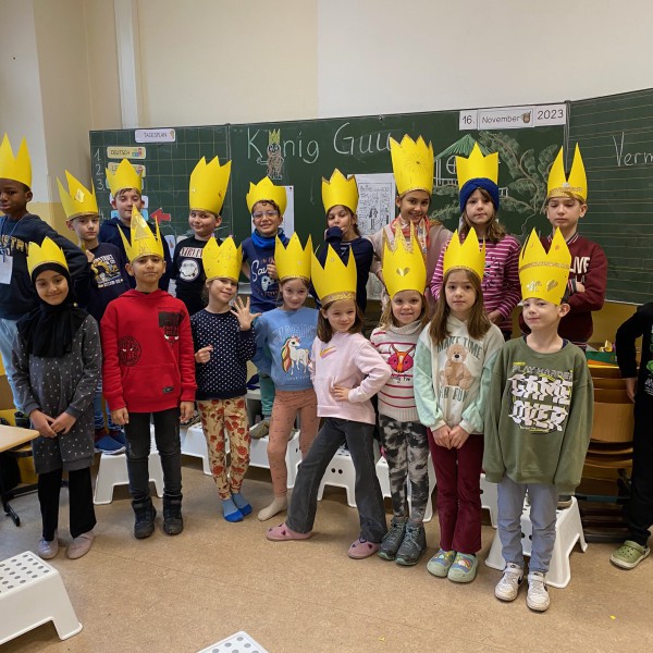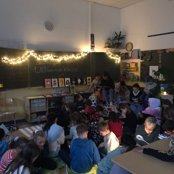 Und da konzentriertes Zuhören auch anstrengend sein kann, konnte man überall in der Schule auch herzliche Momente beobachten, die die Stille des Zuhörens auflockerten. Hier wurden füreinander Bilder der gehörten Geschichten gemalt und verschenkt, Kinder mit mächtigen Kronen liefen durch die Schule, die in die Welt des „König Guu“ eintauchten, Leuchtsterne wurden gebastelt und verschenkt, wie es der Maulwurf aus „Der Maulwurf und die Sterne“ getan hat oder es wurde wild über die „Kurzhosengang“ diskutiert.