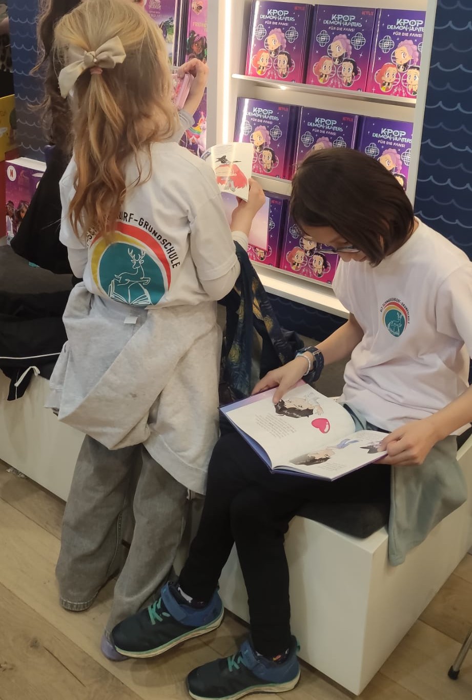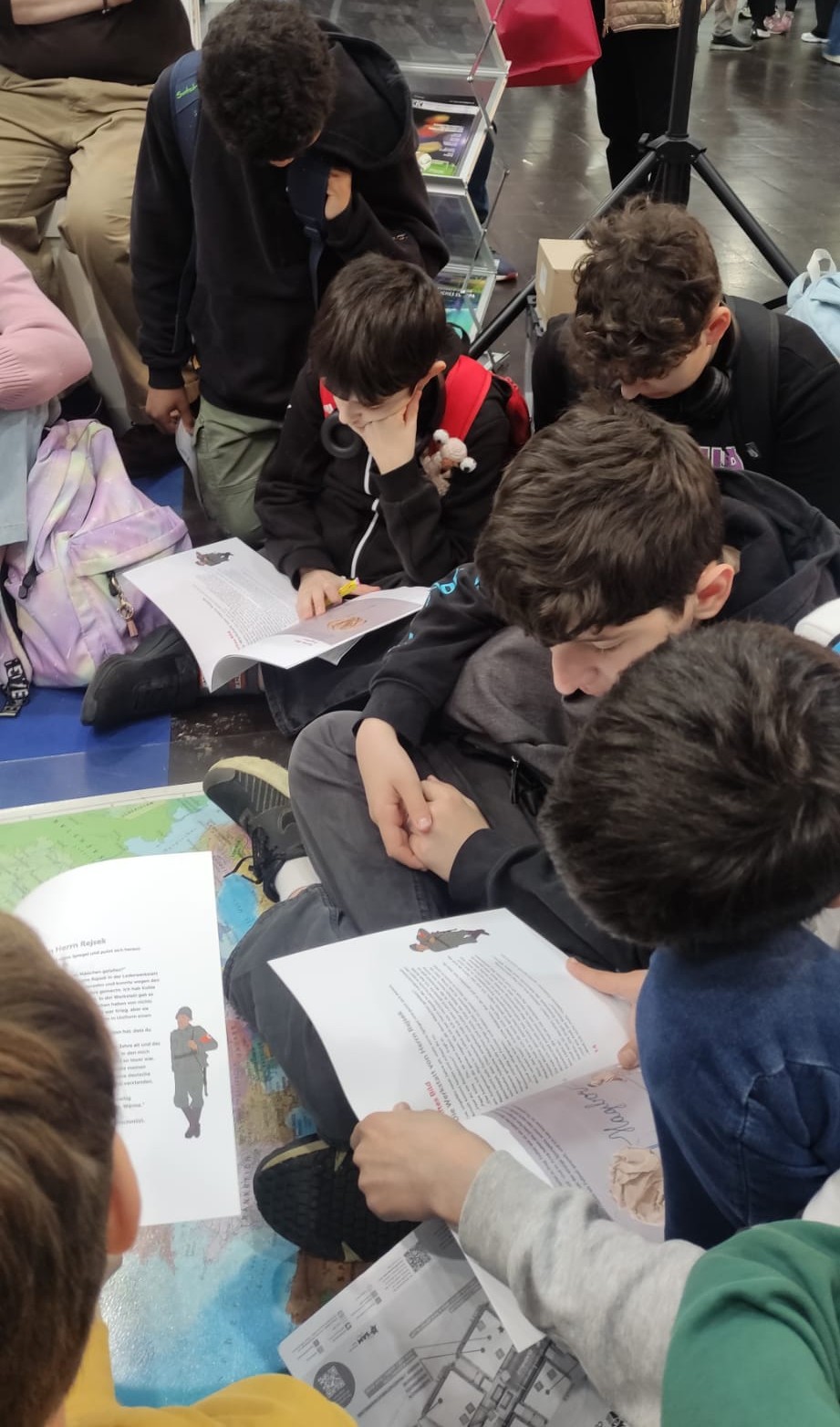 Mit großer Neugierde erkundeten die Kinder im Anschluss die Messehallen, insbesondere die Hallen 1 und 3 mit ihren vielfältigen Kinderbuch- und Manga-Verlagen. Ob Fantasy-Romane, Tiergeschichten, Comics oder Mangas – überall wurde gemeinsam entdeckt und gestöbert. Glücklich tauschten sich unsere Schülerinnen und Schüler auf der Rückfahrt über die neuen Bücher aus, so dass auch diese Geschichten uns weiter verbinden.