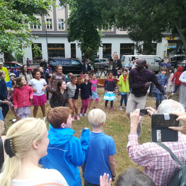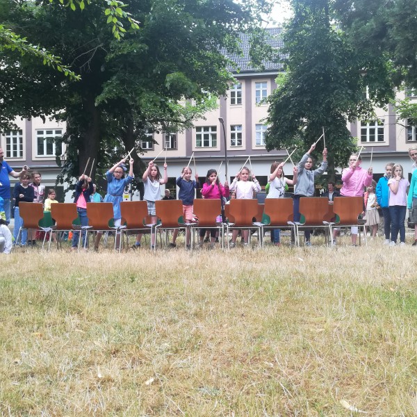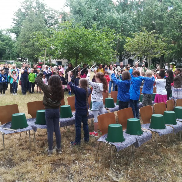 Zusammen mit der Judith-Kerr-Schule gestalteten verschiedene Klassen unserer Schule die "Fête de la Musique" auf dem schulnahen Kolberger Platz. Auf Eimern wurde mit Sticks gute Laune herbeigetrommelt.