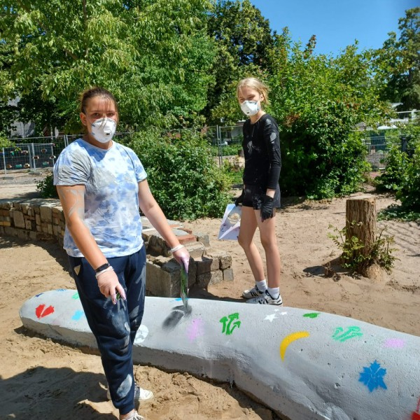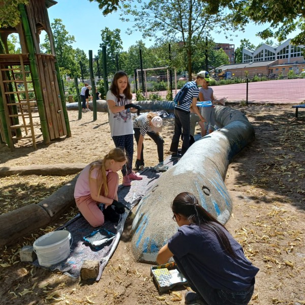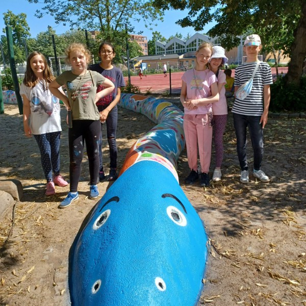 Das Farbspektakel an der ASG reißt nicht ab: Am vergangenen Wochenende haben Frau Schaeffer und Kinder ihres WUV-Kurses „Kunst“ mit Hilfe des Graffiti-Künstlers Mark Straek die Steinschlange auf dem Schulhof farblich neugestaltet. So erstrahlt der graue Stein nun wieder in bunt-leuchtenden und schillernden Farben und lädt zum Herumklettern und Balancieren ein. Ebenso wie der Flur im 1. Stock war auch bei der Schlangen-Neugestaltung die Jugend-Kunstschule Projektgeber. Wir bedanken uns bei dieser, ebenso wie bei den Kindern und Frau Schaeffer für diese tolle Aktion und hoffen, dass die kunterbunte Schlange allen Kindern der ASG noch lange Freude bereiten wird.