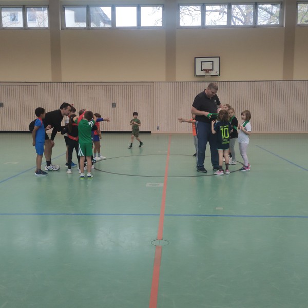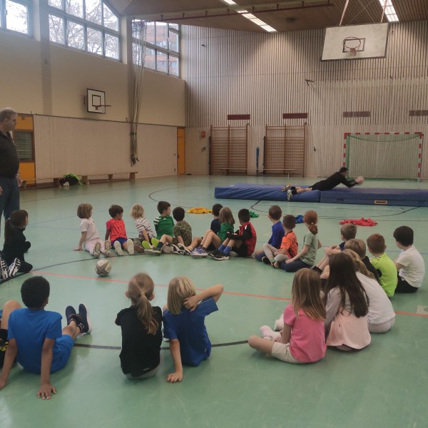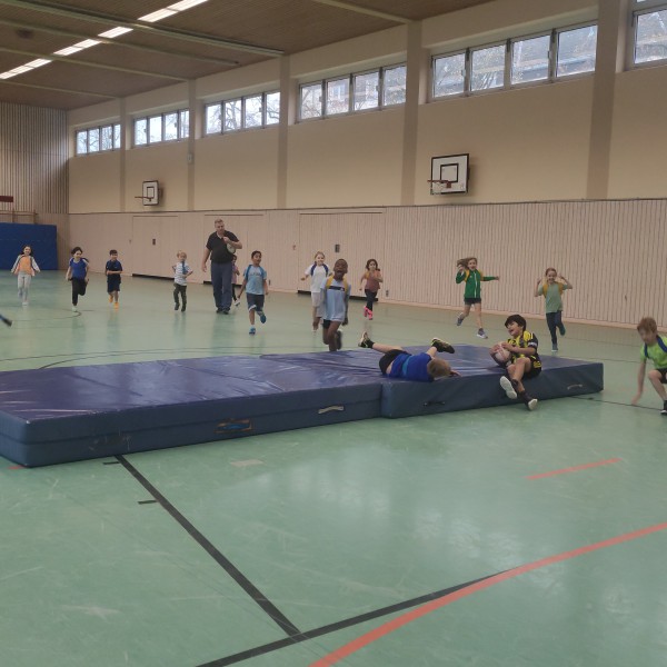 Rugby überzeugt mit wenigen Grundregeln und ist so schnell erklärt: jede und jeder kann Rugby spielen, der Ball wird nach hinten gepasst, der Ballträger wird getackelt und im Malfeld wird nicht gemalt, sondern mit dem abgelegten Ball (Versuch genannt) Punkte erzielt. Zusätzlich zeigte Kim, wie cool man sich auf die Matten, die quasi als Malfeld in der Halle dienten, schmeißt. Ab diesem Moment wollten alle Schülerinnen und Schüler loslegen und selbst einen Versuch im soften Malfeld legen. Ob 1., 3., 5. oder 6. Klasse, alle Spiele waren dynamisch und die Ballabnahmen waren teilweise ziemlich offensiv. Doch der Spaß beim Ausprobieren der noch unterschätzten Sportart kam nicht zu kurz.